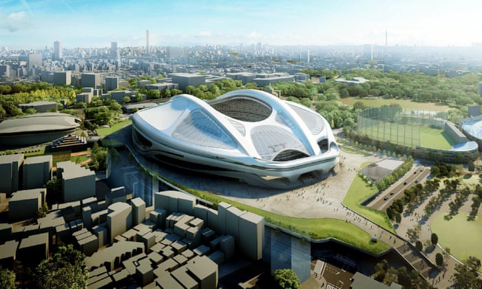 Hadid originálnej konštrukcie na štadióne, ktorý bol tiež v závislosti na hostiteľskom niekoľko zápasov v Rugby World Cup 2019, bol zrušený v júli na žiadosť premiéra Šinzó Abe, potom, čo náklady nafúkli na 252bn jenu (£ 1,3 miliardy), takmer dvojnásobok pôvodný odhad.